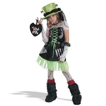 Here comes the bride, who looks like she just died. The Bride of Frankenstein is based off of the 1935 American monster horror film although many people will not relate the two as this kids monster girl costume is too cute.This Monster Bride kids costume includes a dress, ruffled petticoat, green top hat with stitching and bow drape, two hat bolts. The Bride of Frankenstine monster dress is a shiny black vinyl with green lace-up bodice, sheer white sleeve material with black stitching details, green sheer material along the bottom of the skirt and character inspired patches. Boot covers, leg warmers, glovettes, pantyhose and purse are not included. Read more...