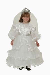 221-T Size: Toddler 4 Features: -Deluxe fancy white bride dress costume. -Available in toddler T4, small 4-6, medium 8-10, large 12-14 and xlarge 16-18 sizes. -Comes complete with dress, silver belt and sequin tiara with veil. Read more...