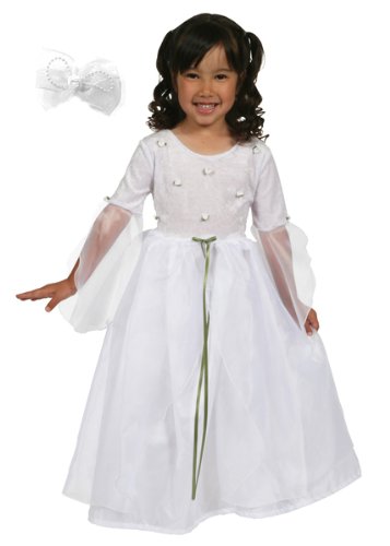 2 item bundle includes costume and matching bow. This bride is perfect in her wedding gown with a crushed white velvet bodice and small white roses with green leaf accents. Draping organza sleeves with an organza skirt over the top of white china silk create a romantic look. The dress is finished with a beautiful white waist trim and sheer green ribbon accent. Add our wedding veil to complete the ensemble. Fullness slip worn under dress is sold separately. This dress comes with a My Cute Dressups hair bow. Color and style of hair bow may vary based on availability. Read more...