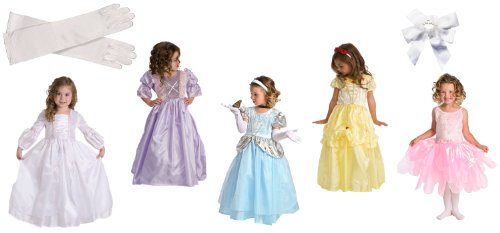 This 6 item bundle includes the following:Deluxe Cinderella (reg. )A dress made for the ball. The sky blue crushed velvet bodice is adorned with beautiful silver trim, and the china silk skirt is overlaid with sparkly organza. The sleeves and hip drapes are a soft silver fabric that shimmers at the stroke of midnight. Choker and headband sold separately.Yellow Beauty (reg. )Transform into the Belle of the Ball in this charming fairytale classic. The stretchy yellow velvet bodice is gracefully designed with sparkling gold trim and an elegant collar adorned with red rose accents. The flowing skirt is layered with ruffles and roses to complete the princess look.Princess Bride (reg. )Princess bride is perfect in her wedding gown with a white velvet Parisian style bodice and adorable rosebud trim. The sleeves are also complimented with the rosebud trim.The beautiful organza over lay looks creates a romantic look. The dress is finished with a beautiful white waist trim and gathered ruffles on the skirt. Add our wedding veil to complete the ensemble.Rapunzel (reg. )This classic princess dress includes a pink and purple crushed velvet bodice with beautiful silver criss-cross trim and accents. The mid-length princess sleeves and skirt are made of purple china silk.Pink Tulip Fairy (reg. )This wonderful fairy dress up has two layers of shimmery pink organza with a delicate scalloped edge overlaid a china silk under skirt. The bodice is made of stretchy pink crushed velvet, and the skirt is highlighted with six iridescent fabric petals and three pink and white pansies.DOES NOT INCLUDE the Cindrella choker, hair band or a fulness slip. Accessories sold separately.The dresses are all machine washable and comfortable to wear all day long. Both the bodices and skirts are stretchy to accommodate most body sizes. Read more...