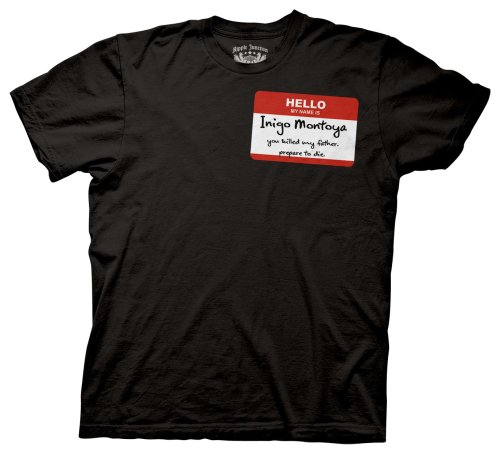 100% preshrunk cotton t-shirt based on the Princess Bride movie. The shirt is black with a front print designed specifically to look like a name tag. Nametag reads "Hello, my name is... Inigo Montoya. You killed my father, prepare to die." Awesome and unique shirt for fans of the movie. Officially licensed by Ripple Junction Read more...